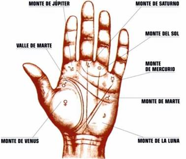La mano está dividida en zonas llamadas MONTES, dándole el nombre de un planeta a cada uno, con las características alusivas a la interpretación astrológica de éste.