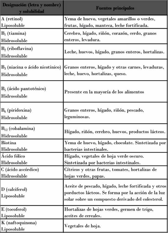 Las vitaminas son un grupo de sustancias orgánicas (compuestos que contienen carbono) que se encuentran en ínfimas partes en los alimentos y son necesarias para el mantenimiento de la vida. El cuerpo no puede sintetizarlas, debe ingerirlas. Son un eslabón necesario para casi todos los procesos biológicos en nuestro organismo, por eso cuando están presentes, se dan de forma regular. Algunos de ellos son: maduración de glóbulos rojos, absorción de calcio, formación de pigmentos visuales, síntesis de colágeno, entre otros.