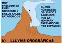 b) Ascenso orográfico: el aire choca contra la ladera de una montaña y se ve obligado a subir.