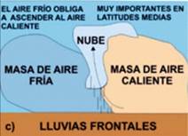 c) Ascenso frontal: es debido al choque de dos masas de aire, una fría y otra cálida. La fría (menos liviana) obliga a la más cálida a desplazarse sobre ella, ascendiendo, y así se logra la expansión.